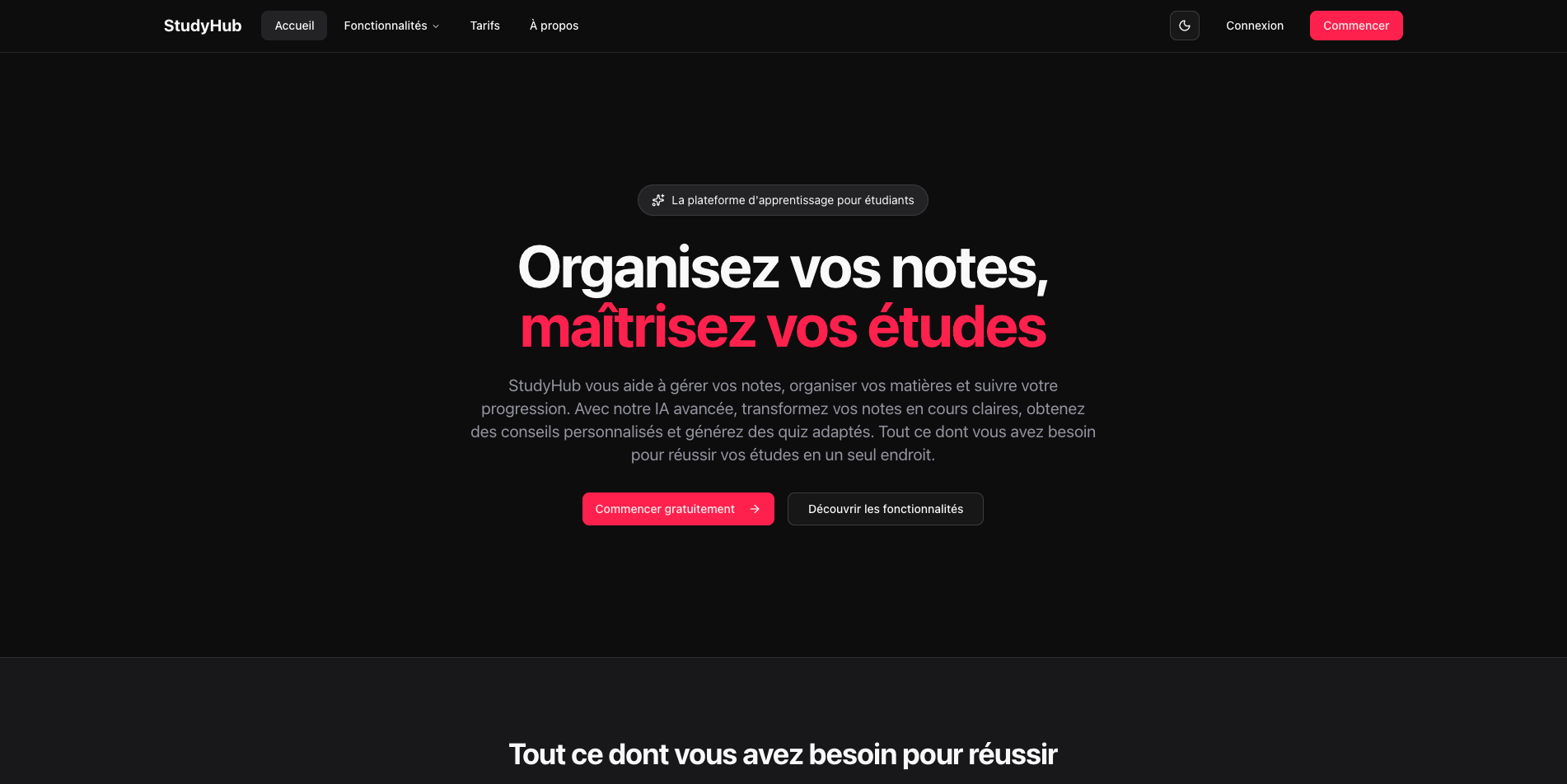StudyHub01-2026 - 01-2026StudyHub est une application web qui permet aux utilisateurs de suivre leurs études, de gérer leurs projets et de partager leurs connaissances. Ils peuvent également générer leurs propres cours, ainsi que générer des exercices et des quiz.